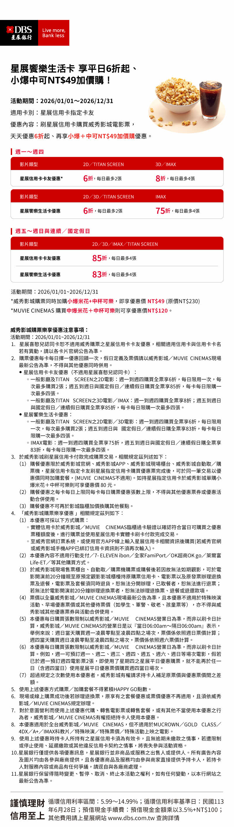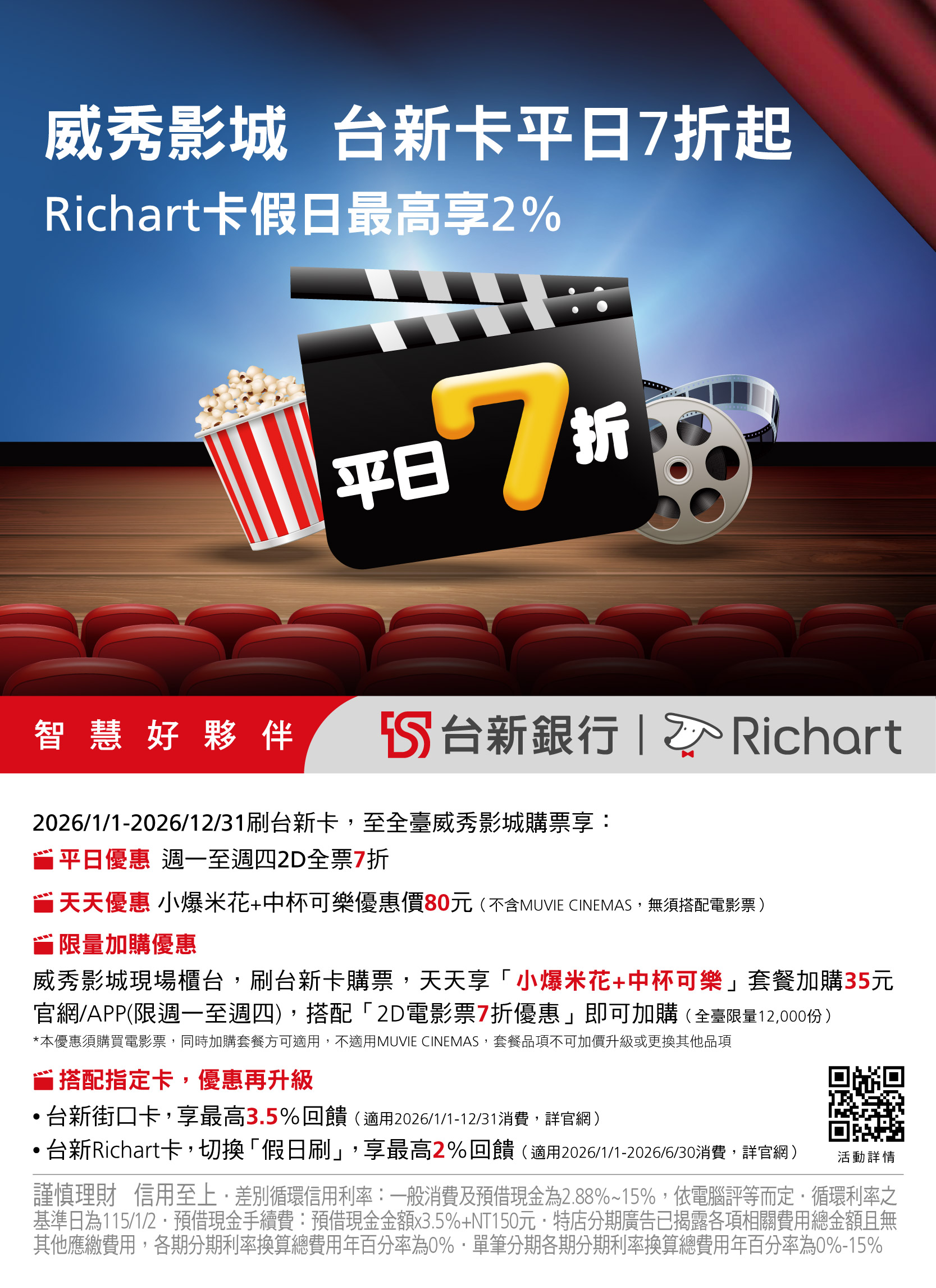🎬 限量加購優惠:威秀影城現場櫃台,刷台新卡購票,天天享「小爆米花+中杯可樂」套餐加購35元