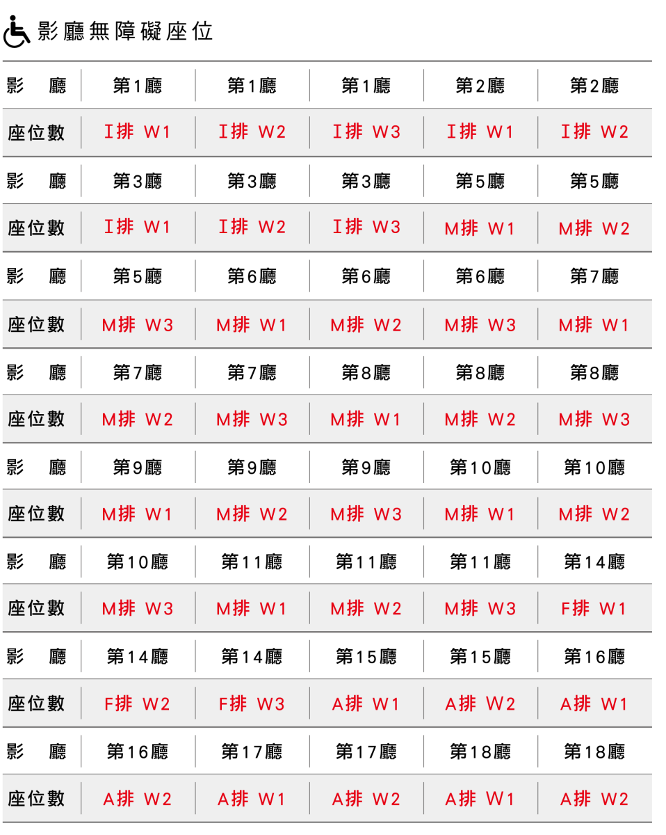 *所有售票通路同步開放購票(另有公告之場次除外),黃色底時間代表即將售完/紅色底時間為完售,實際剩餘座位數請洽影城售票窗口
